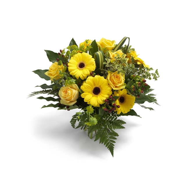 Ett brett leende smittar av sig från denna uppiggande gula bukett med rosor och gerbera. Dekorativa bär är glatt ackompanjerade av mångfärgade blad.