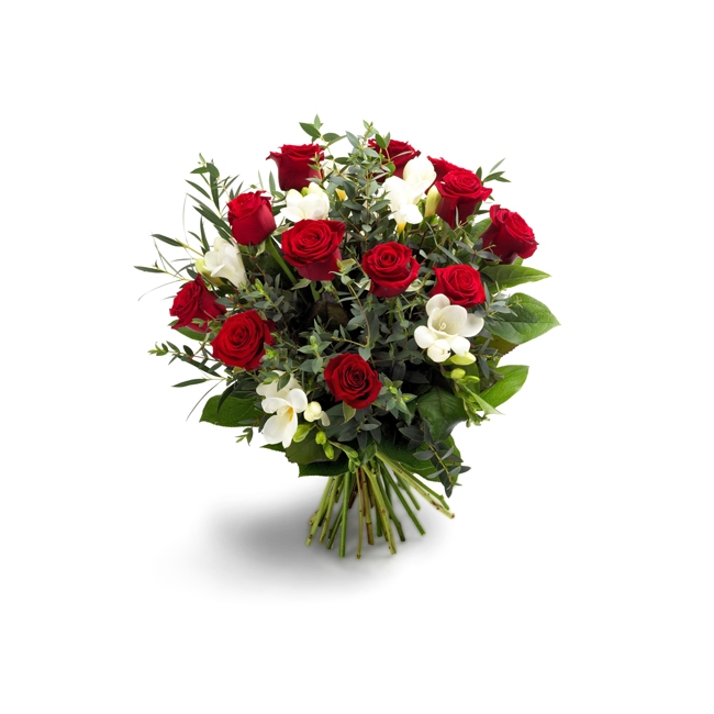 En klassiskt inspirerad bukett av röda rosor och vit freesia, tillsammans med fräscht grönt.
