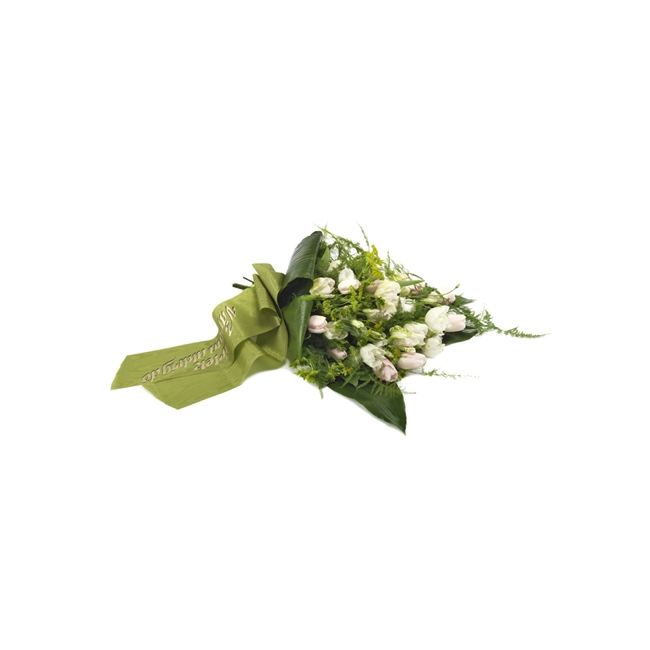 Graciösa tulpaner. Till minne av en elegant och charmerande person. Den här sorgbuketten består av vårblommor som tulpaner och daggkåpa. Full av hopp och ljus. Band ingår inte.