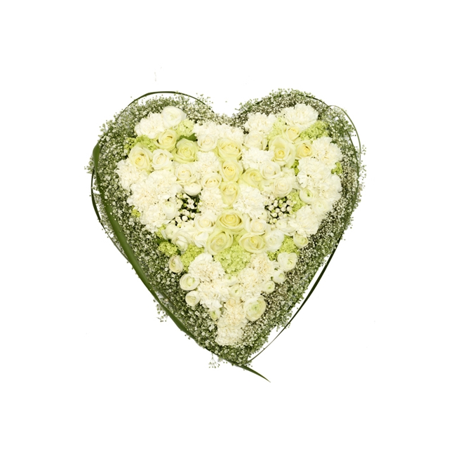 För en ärlig person med ett hjärta av guld. Vackra vita rosor och nejlikor formar ett elegant hjärta. En hyllning in i evigheten.