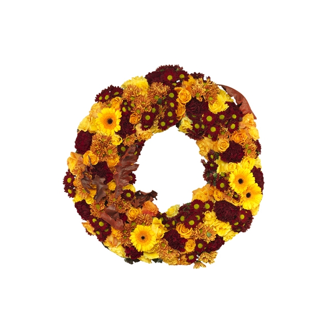 Lika varm som omtänksamheten hos en medmänniska. Lika färgstark som en livlig personlighet. För att skapa denna rika och intensiva begravningskrans har alla höstens fantastiska färger tagits med i arrangemanget.