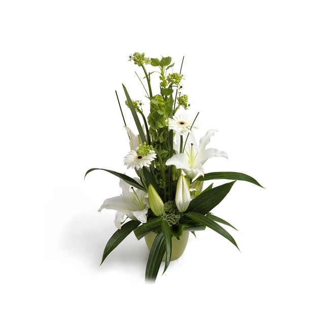 Ett torn av majestätisk grönska! Arrangemang i vitt och grönt med gerbera och lilja, vackert omringat av grönt lövverk, i matchande kruka.