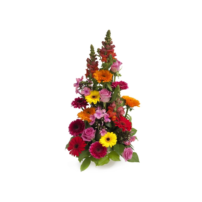 Färgsprakande festlighet! Fantastiska färgkombinationer i rosa, gult, rött och orange. Rosor, gerbera och grönt är bara några ingredienser i denna blomstrande gåva.
