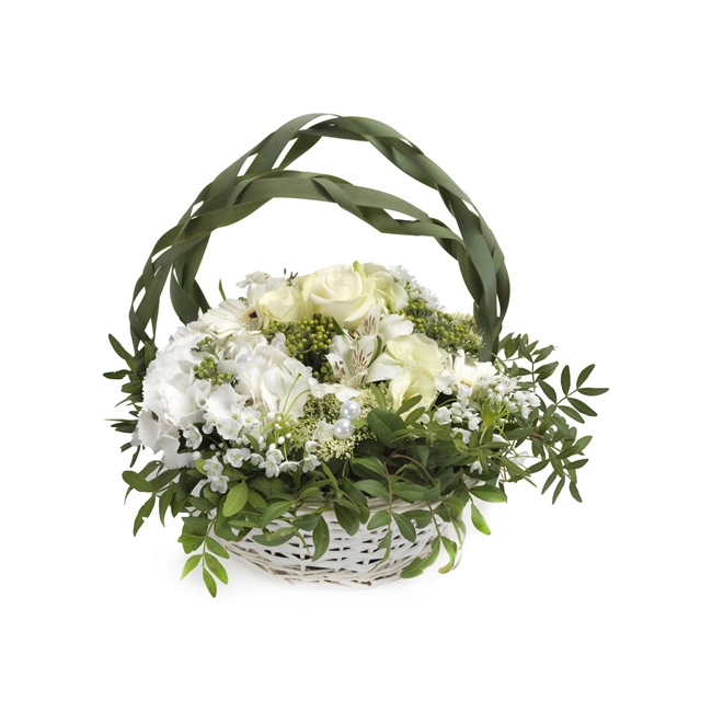 Floristens blomstrande motsvarighet till gourmet-korgen! Sju sorters blommor i vitt, bland annat rosor, nejlikor och prärieklocka, nerbäddade i vit korg med vackra handtag av flätat gräs.