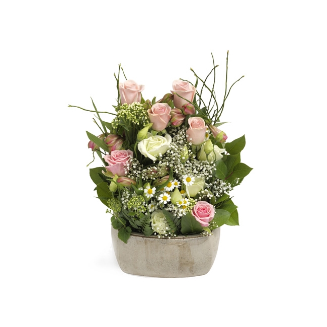 En muntert ros-arrangemang i rosa och vitt. Med brudslöja och gröna blad, ger den ett lagom romantiskt intryck som passar de flesta tillfällen.