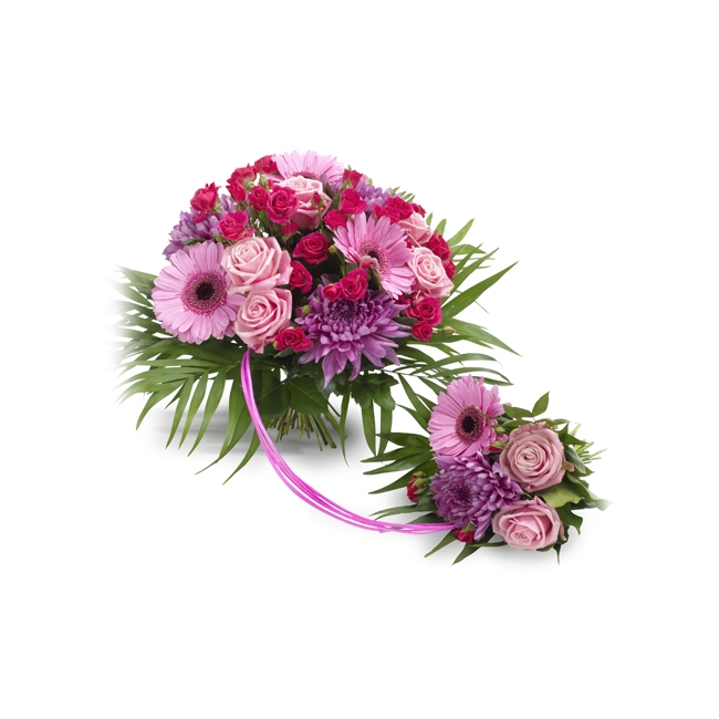 Symbolisk mor- och barnbukett i rosa och lila med rosor, krysantemum och gerbera.