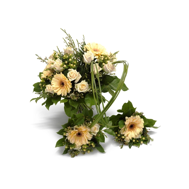 Tvillingsjäl! Sober mor- och barnbukett med champagne och aprikosfärgade blommor. Till mor med nyfödda tvillingar. Passar både pojkar och flickor.