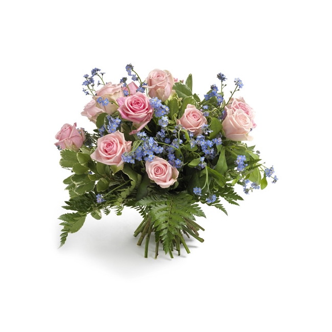 Sockersöt pastellrosa rosbukett, med nätta blå blommor som dansar i det gröna.