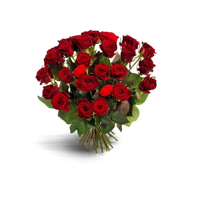 Sammetslena röda rosor i bukett, kan vara svårt att toppa, men de små söta dekorations-hjärtan som verkligen sitter på toppen av den här buketten gör det där lilla extra.