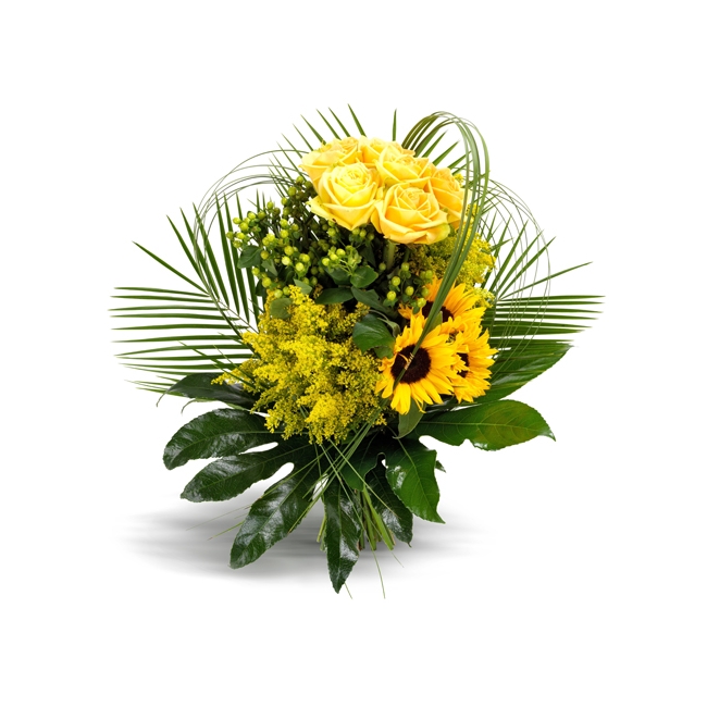 En lyxig sommarhälsning! Solrosor, gula rosor och limefärgat i flera nivåer, gör denna höga bukett till en glädjefröjd i betraktarens öga.