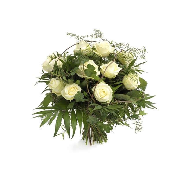 Vit rosbukett med läckert grönt.