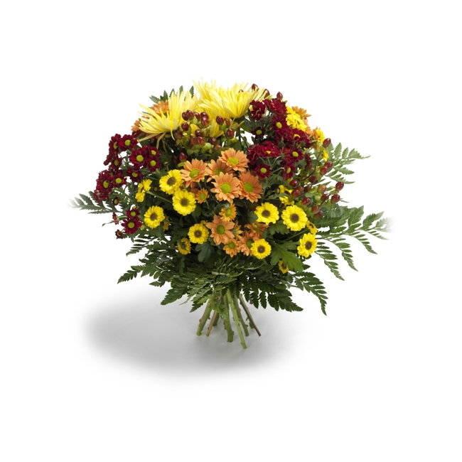 En harmonisk bukett krysantemum i höstens varma toner och med säsongen gröna. En blomsterbukett som helt enkelt skapar harmoni i vilket rum den än pryder, och delar med sig av sin värme till alla hjärtan.