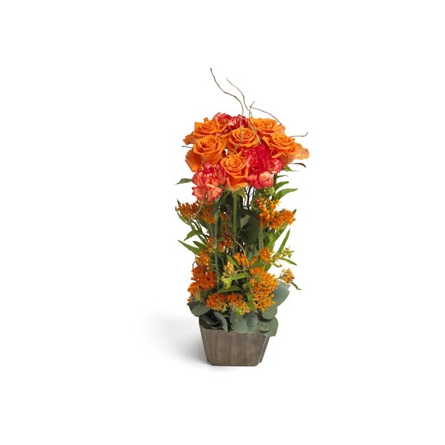 En modern blomsterskulptur av orange rosor som passar när helst på året. .
