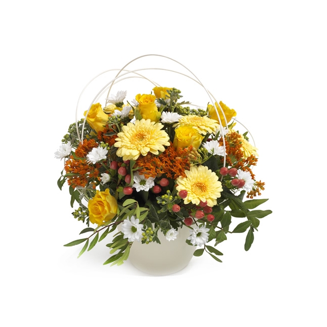 Skicka en hälsning med blomstrande liv! Gula rosor, gerbera och bär, har gjort sällskap med vita blommor, vackert inramat av säsongens gröna.