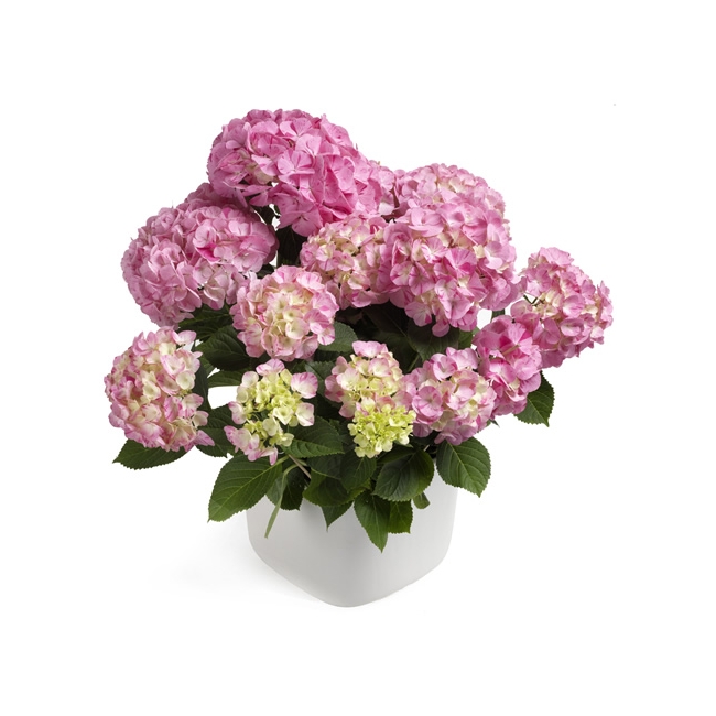 Den tidlösa hortensian, här i romantiskt rosa och planterad i en modern kruka. Kul att veta: Många arter av Hortensia har blommor vars färg bestäms av ph-värdet i jorden.