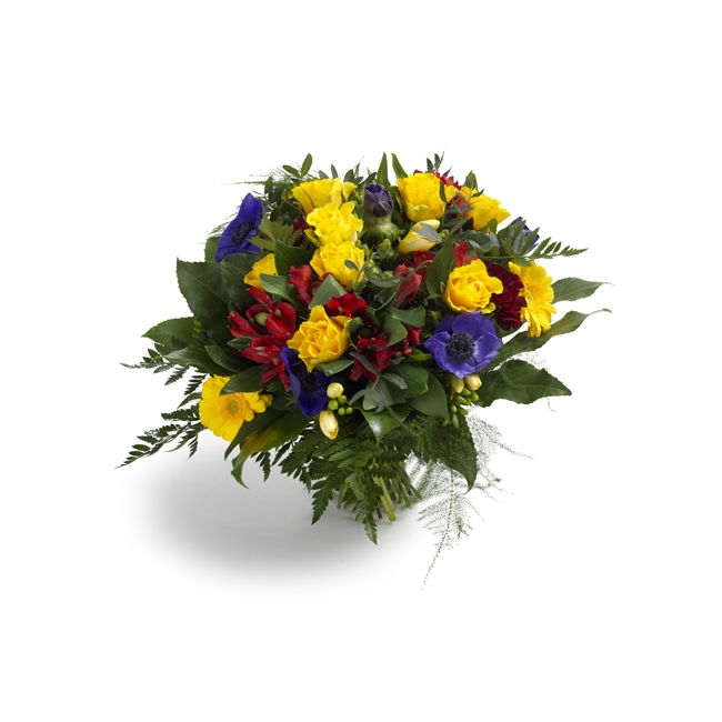 Festlig karusell av färger! Bjud in gult, blått och rött till en blomstrande dans och resultatet blir en sprakande bukett med klassiska rosor och gerbera med en smak av säsongens blommor.